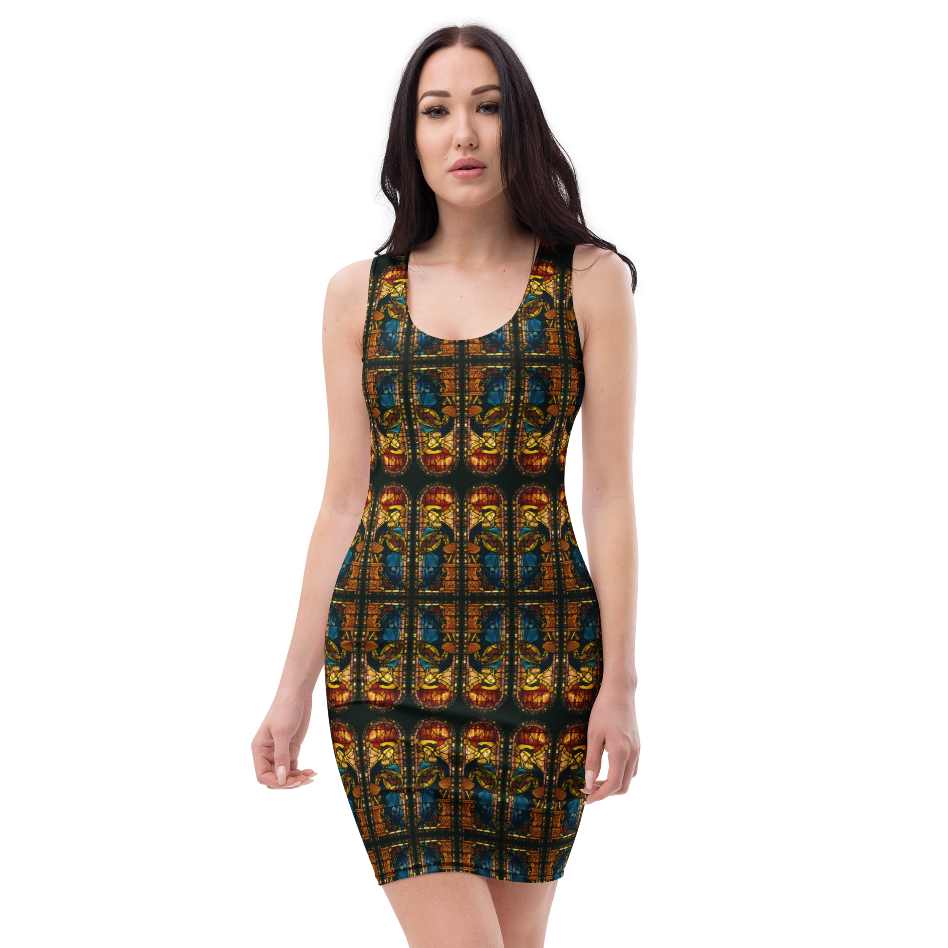 Experience timeless elegance with this form-fitting dress; the design on it was inspired by a 1498 Renaissance era Stained Glass Masterpiece titled "The Virgin Annunciate."
