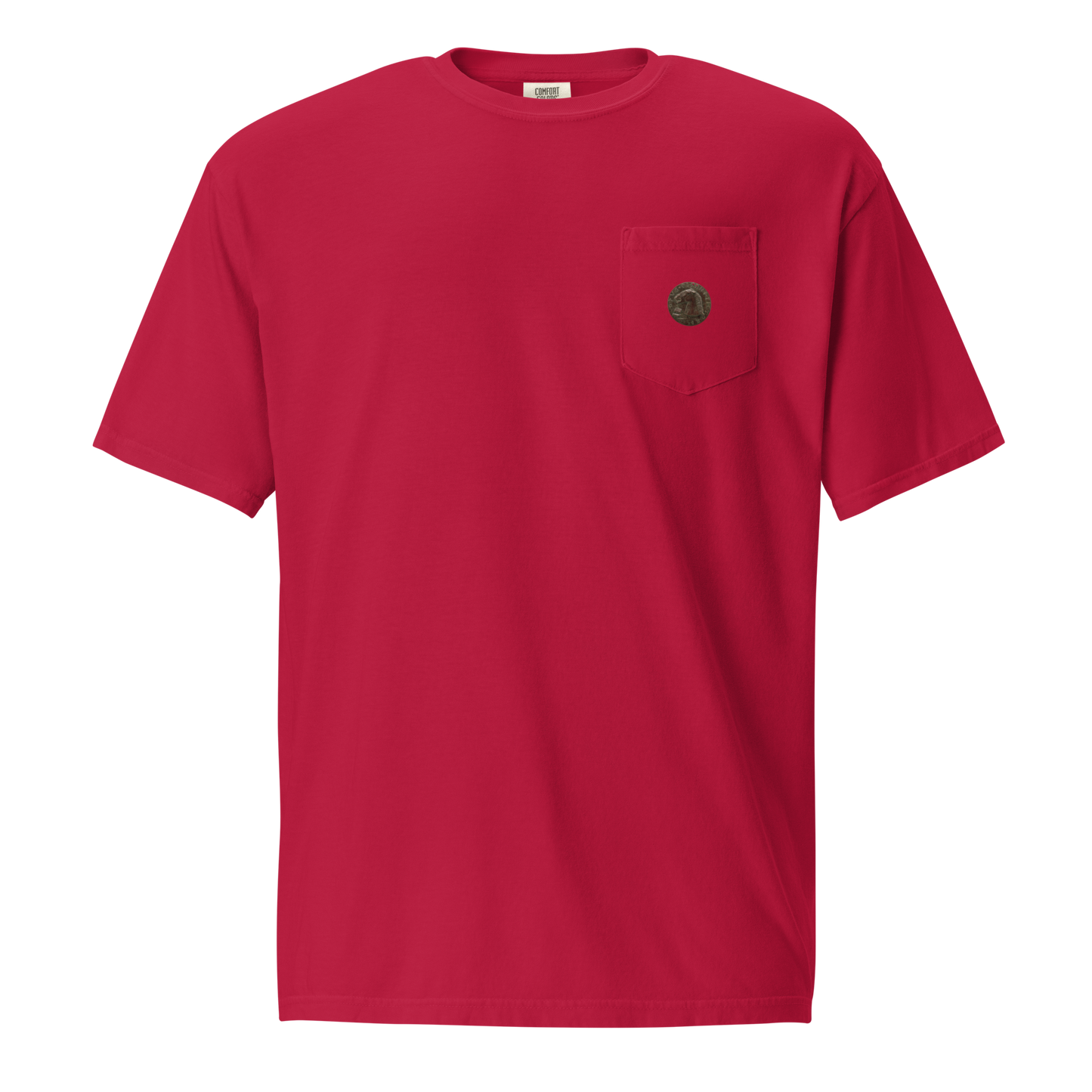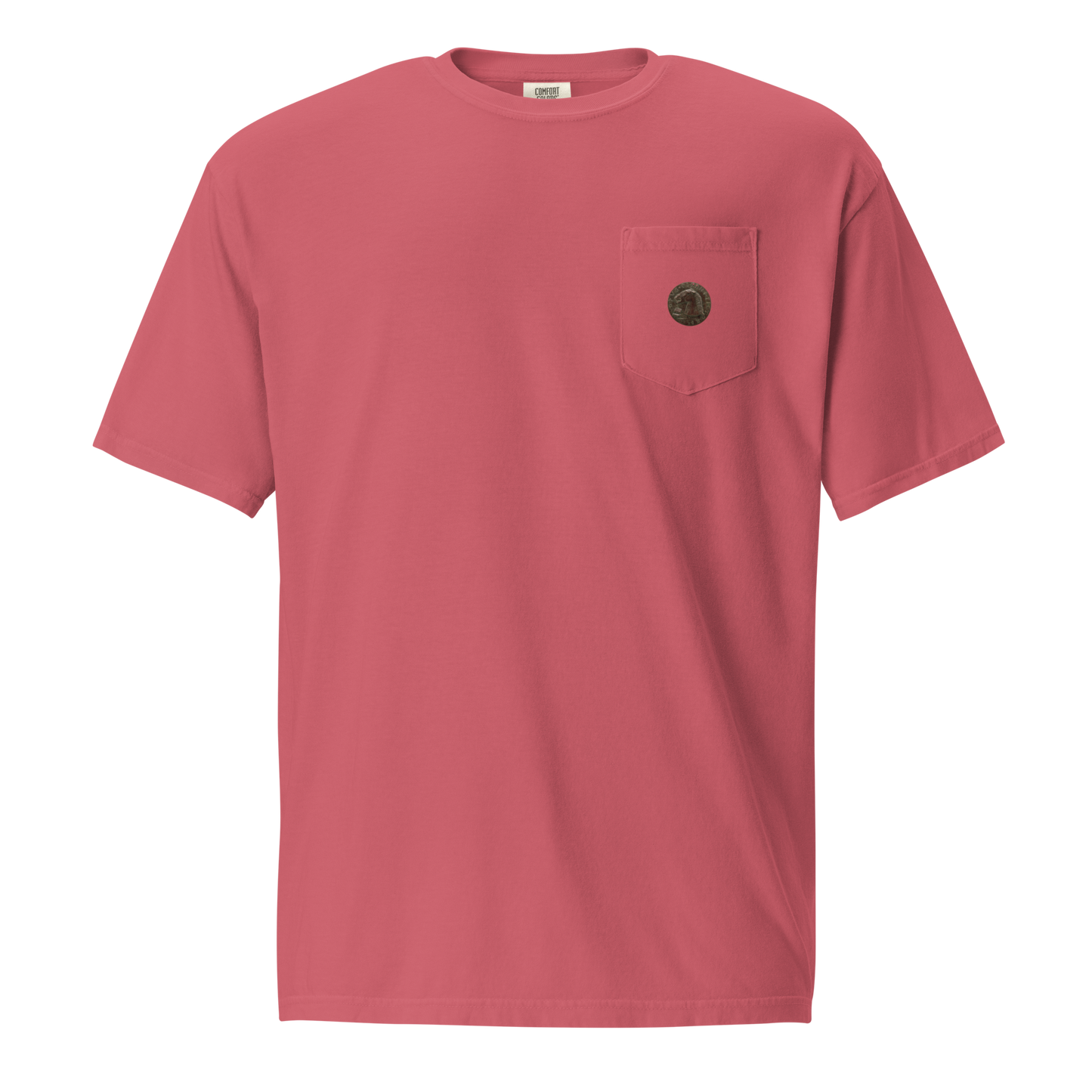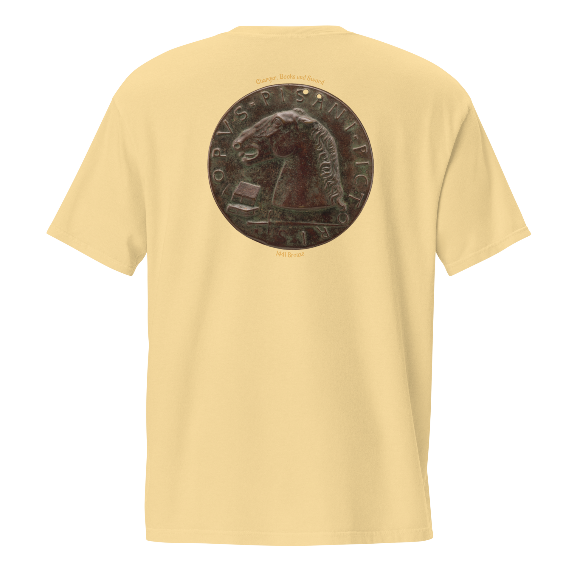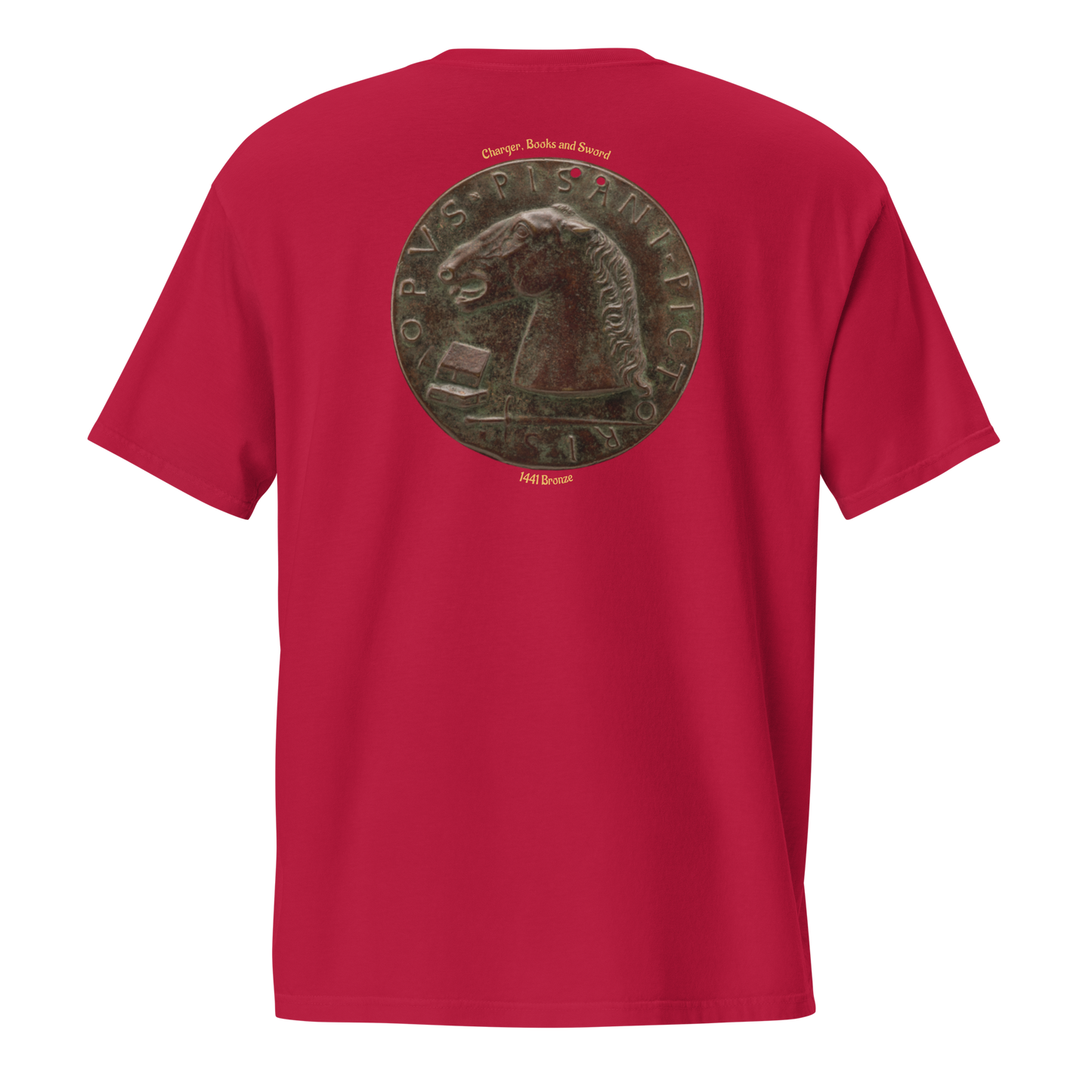 Elevate your casual style with this MEN'S POCKET T-SHIRT - "Charger, Books and Sword," a Bronze coin that was created in the year 1441.