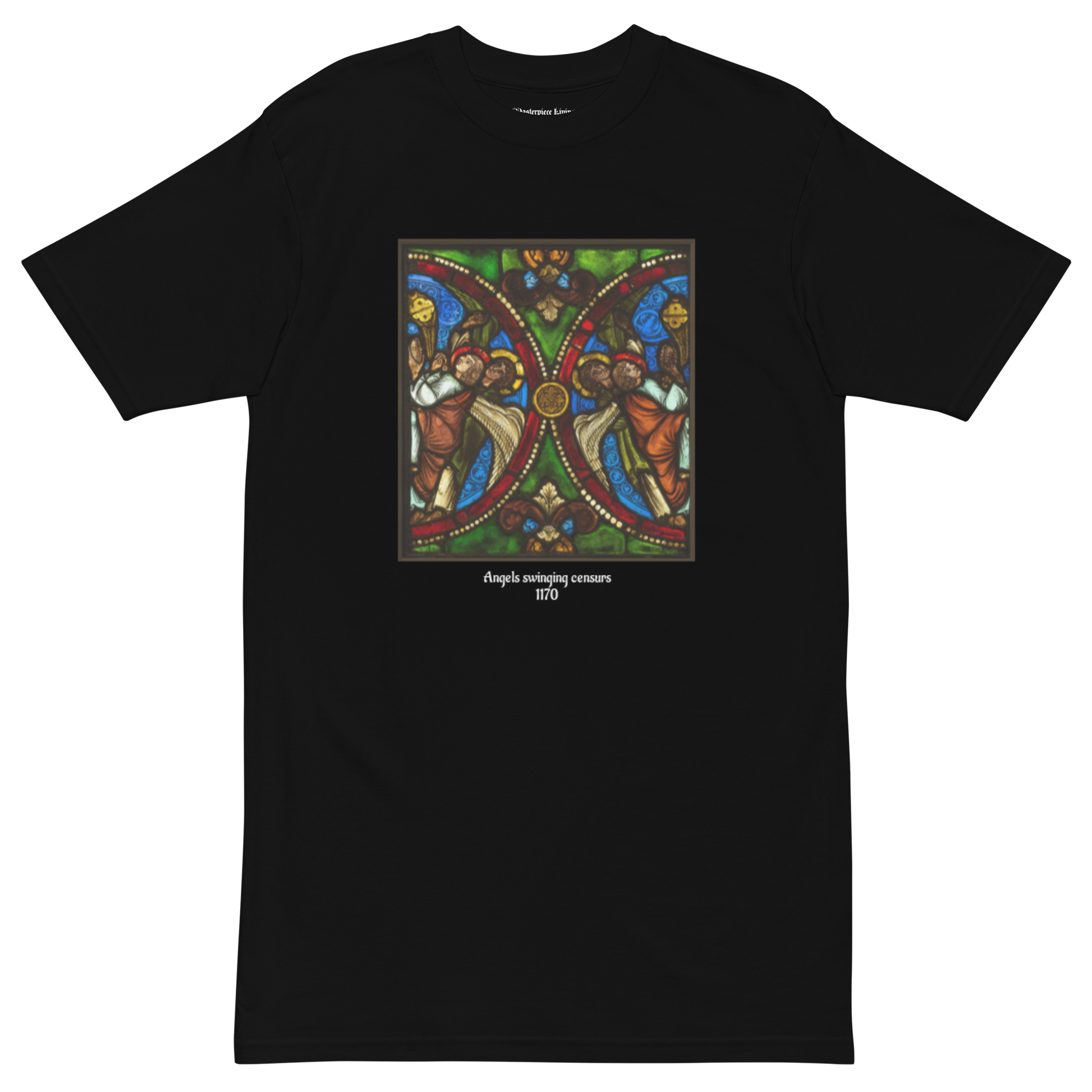 Make a bold statement with this men's premium heavy weight tee, featuring a striking image of the 1170 Byzantine stained glass masterpiece, "Angels Swinging Censurs."