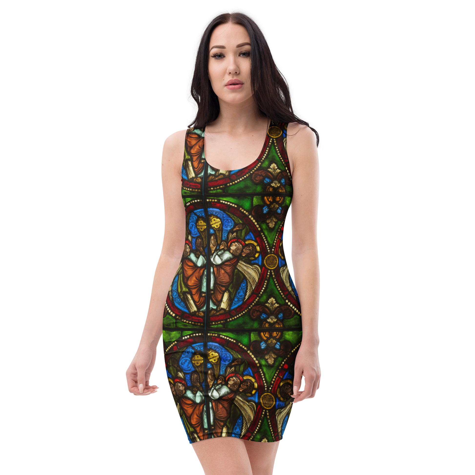 This form-fitting dress offers versatile elegance, suitable for both casual daytime outings and refined evening events. Its design draws inspiration from the intricate 1170 Byzantine stained glass masterpiece "Angels Swinging Censurs," reflecting timeless artistry through modern fashion.