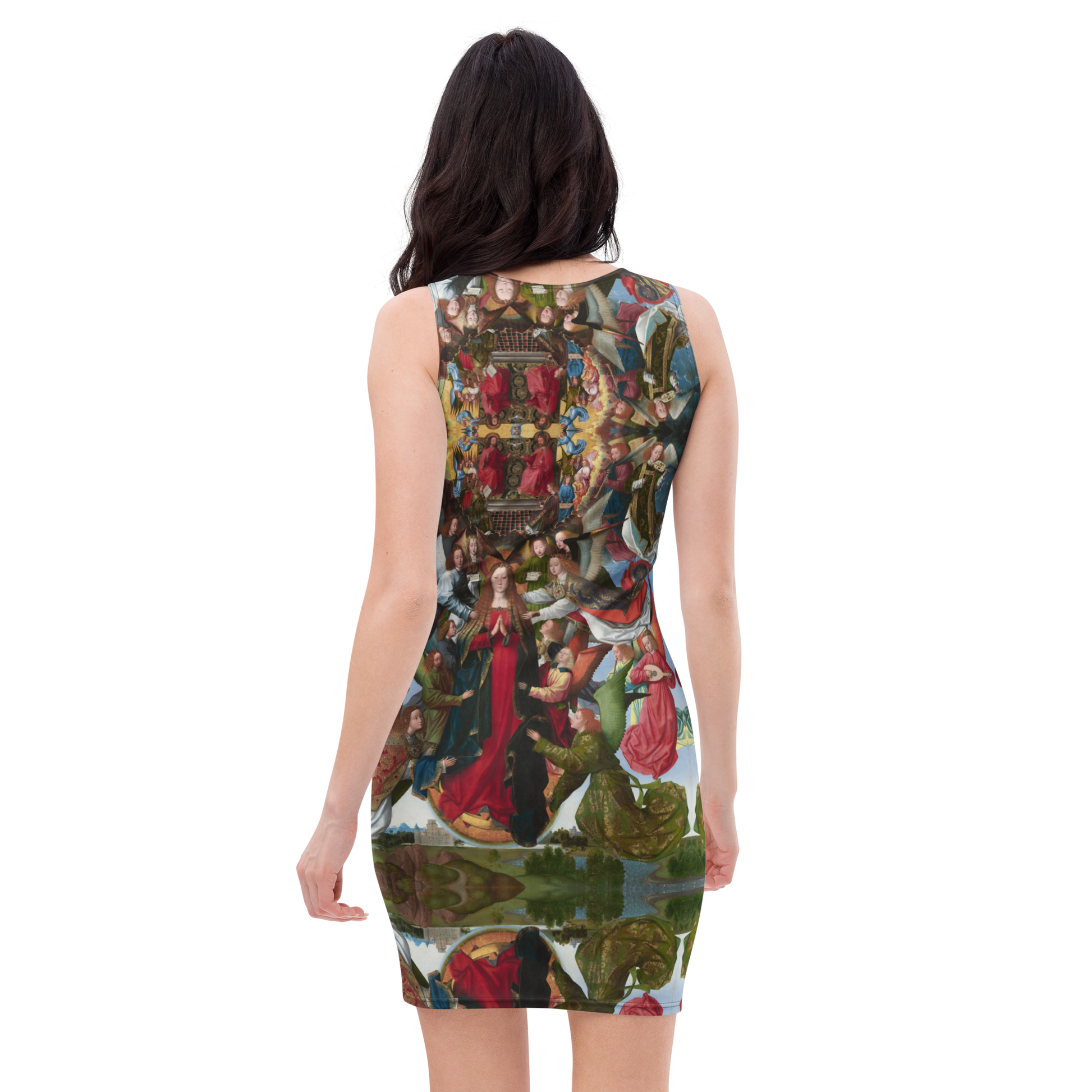 This form-fitting dress draws inspiration from the iconic Masterpiece "Mary, Queen of Heaven" (1485), blending art and fashion seamlessly.