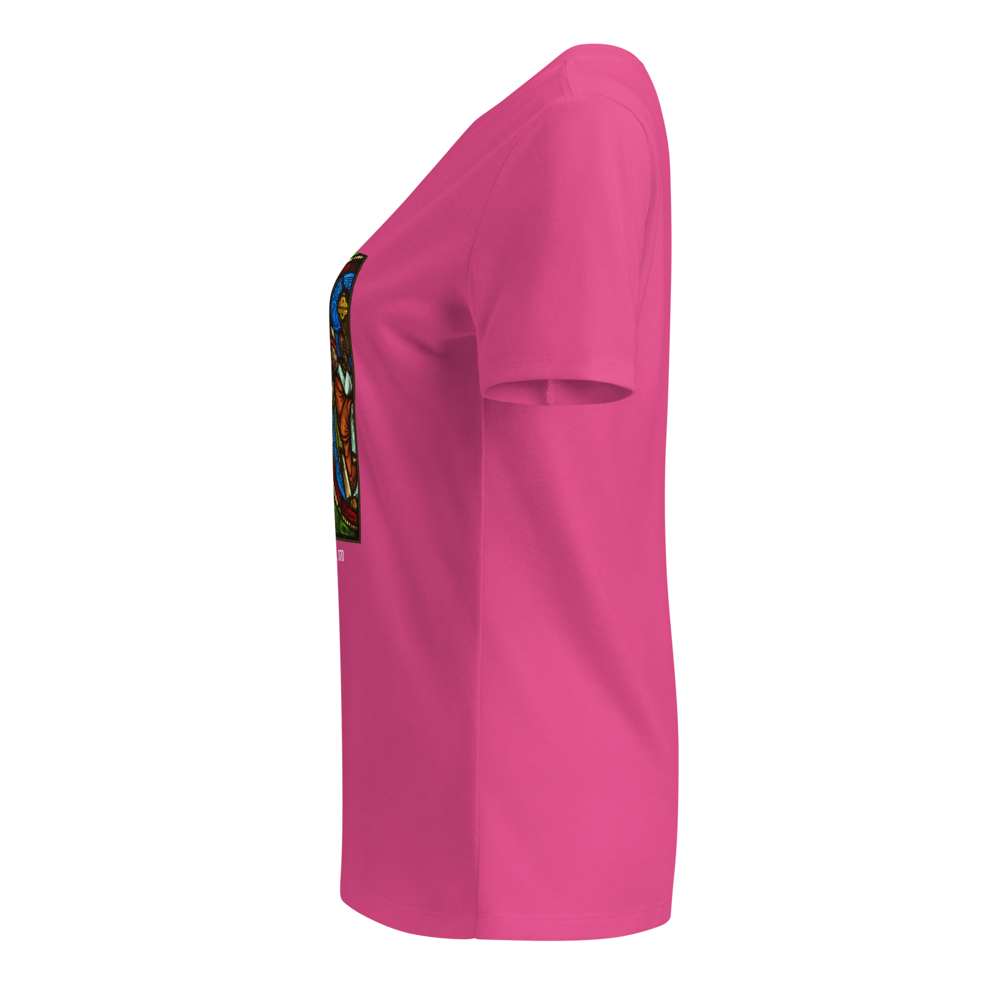 Bring some playful charm to your outfit with this Women's Relaxed V-Neck Tee Shirt featuring a design inspired by the whimsical image of the ancient stained glass masterpiece "Angels Swinging Censurs", created in the year 1170.