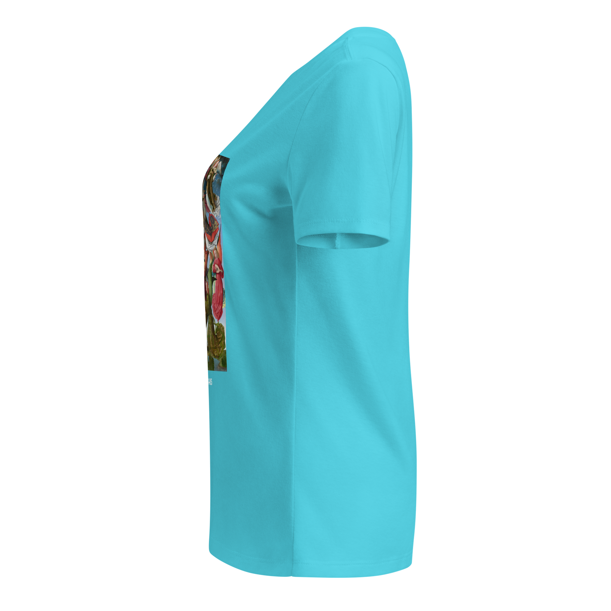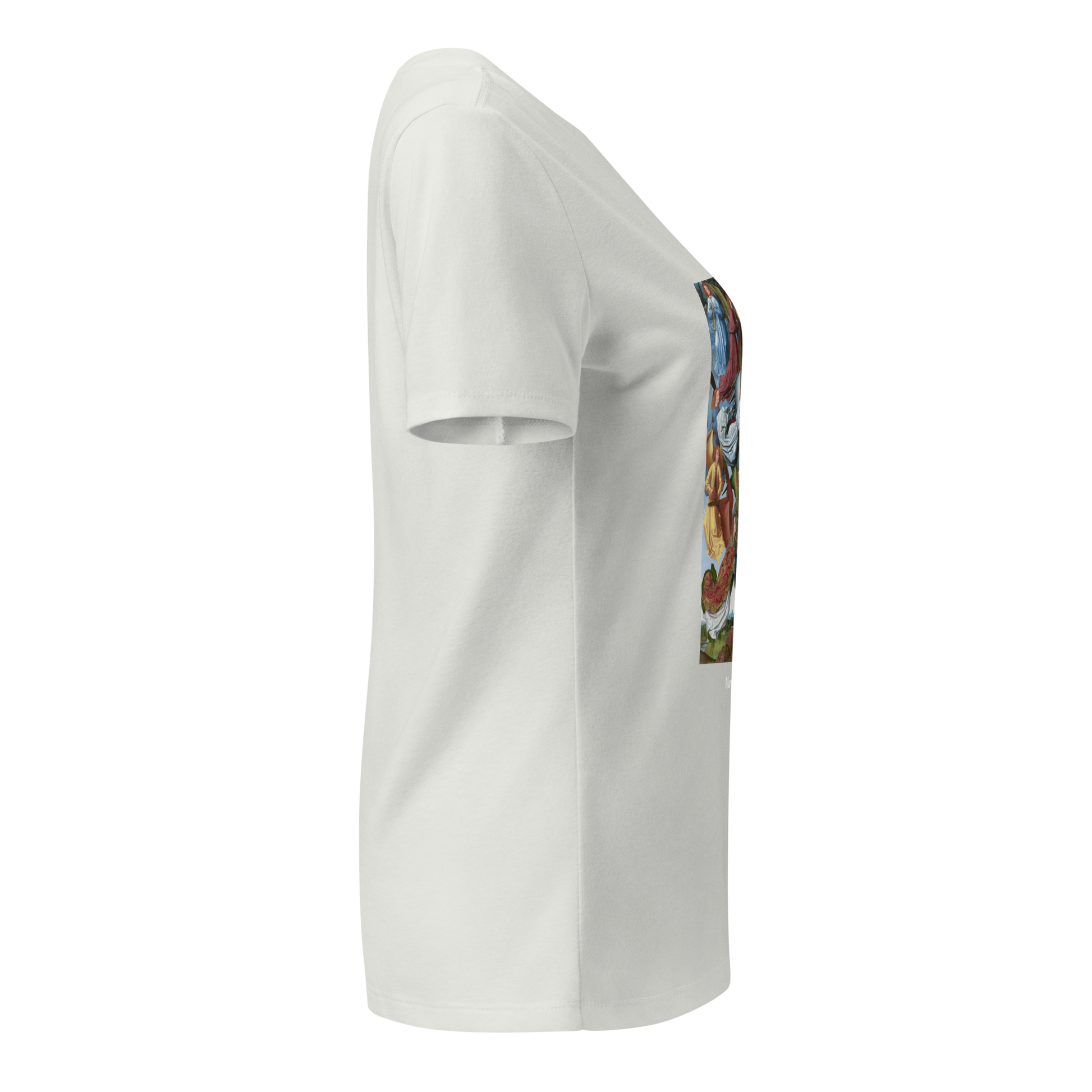 Elevate your wardrobe with this Women's Relaxed V-Neck Tee featuring an image of the timeless masterpiece titled "Mary, Queen of Heaven", painted in the year 1485.