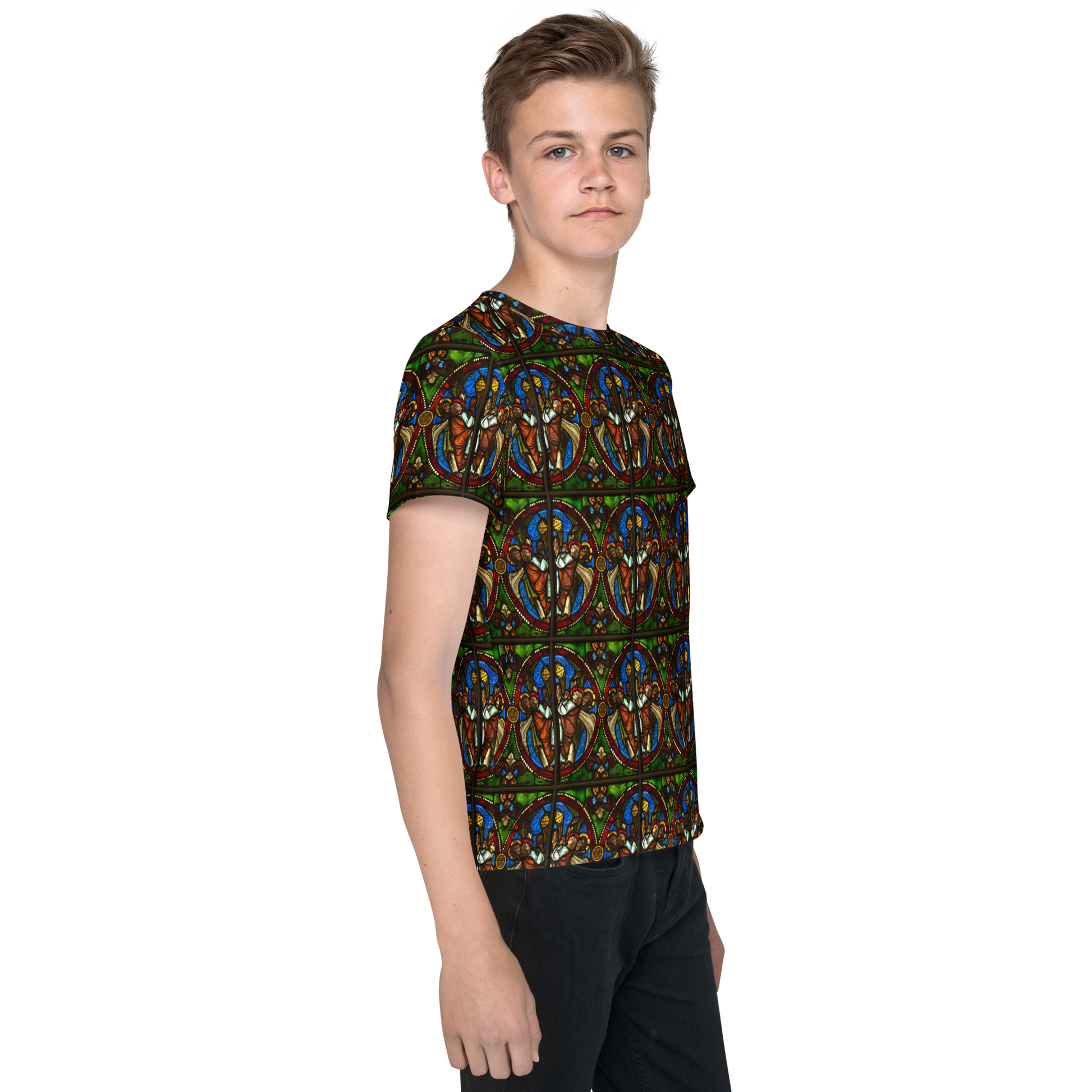 Get ready to turn heads with the Youth Crew Neck T-Shirt featuring a design inspired by a Byzantine era stained glass masterpiece with lively angels that was created in the year 1170, titled "Angels Swinging Censurs"!